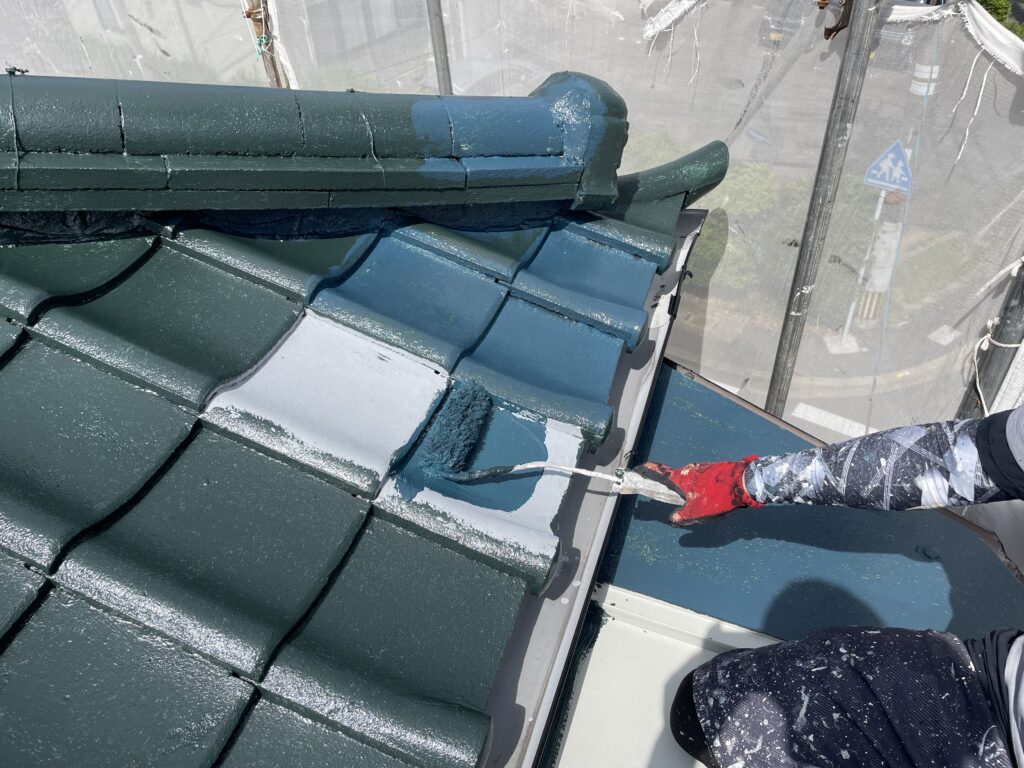 屋根の機能性や防水性能を高めるために、塗膜の厚みなど細かい部分まで気を配り上塗りしました。 -