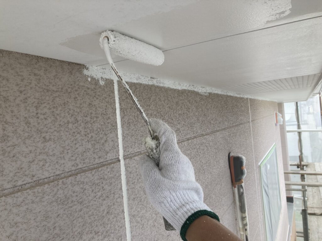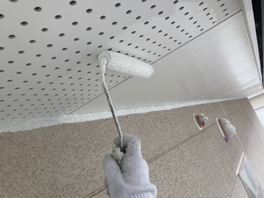 軒天の塗装を行いました。軒天は湿気やカビが発生しやすい部分のため、防カビ性・防湿性に優れた塗料を使用 -