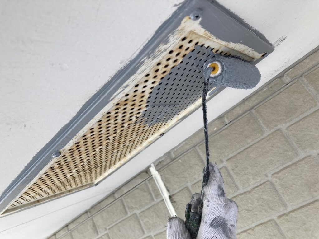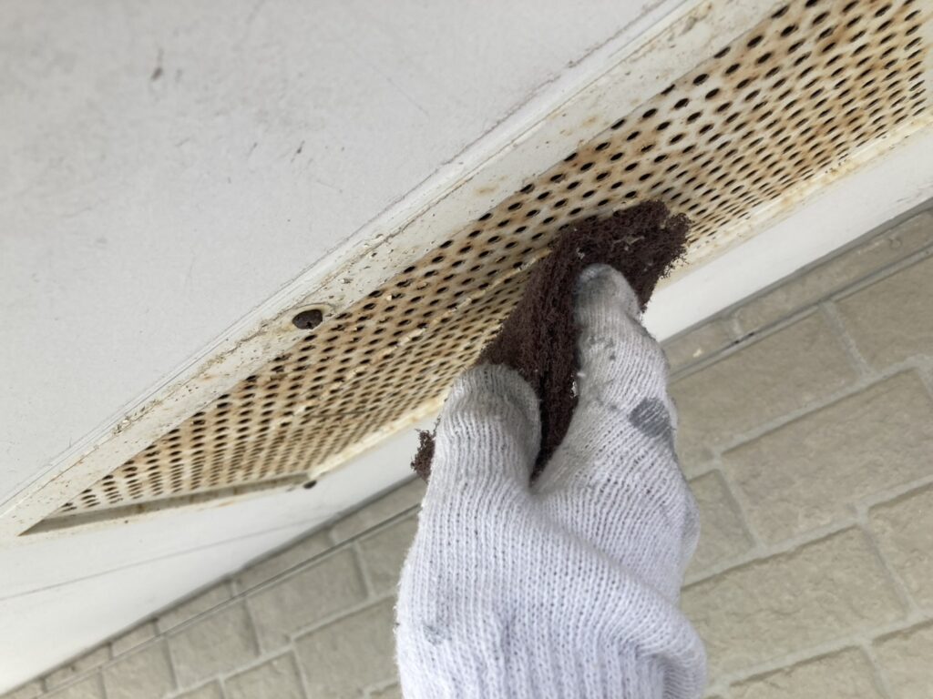 換気部分は、塩害で錆が発生。ケレン作業で丁寧に落としています -