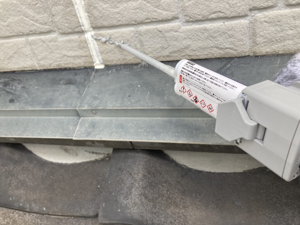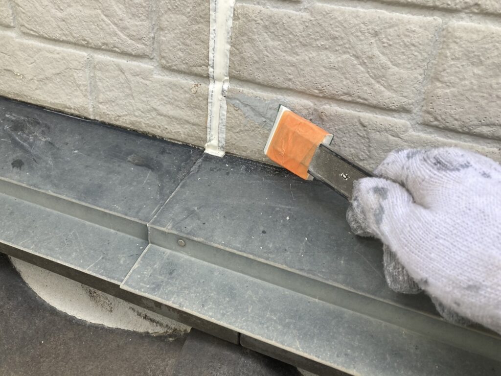 雨水の侵入を防ぐため、均一になるよう確認しながら施工しています -