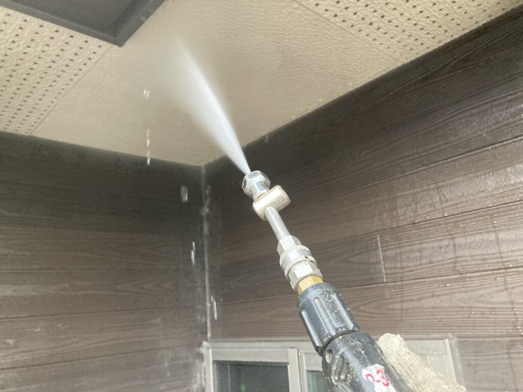外壁の汚れや旧塗膜を丁寧に洗浄し、塗料が密着しやすい下地を整える重要工程です。